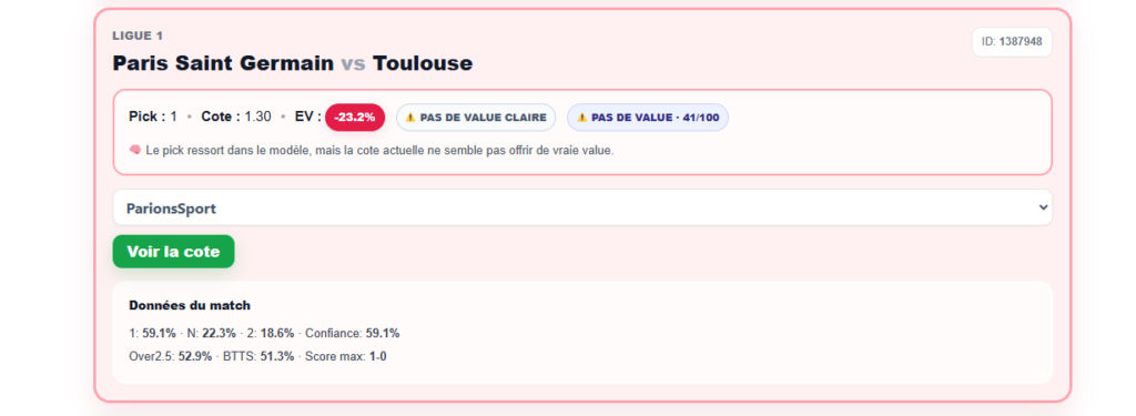 This is precisely where the Premium page becomes truly valuable. Footprobability doesn't just look at which team has the best chance of winning. The site also compares this estimated probability to the market odds. In the case of PSG versus Toulouse, the model does indeed consider PSG the favorite, but the odds offered are deemed too low. In short, the bookmaker is paying out too little for this scenario relative to the actual risk of the bet. This is why the match frame appears in red.