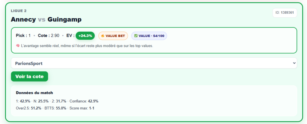 Conversely, when a match presents a genuine opportunity, the display turns green, as seen in the Ligue 2 match between Annecy and Guingamp. This means that the probability estimated by the model is higher than what the bookmaker's odds suggest. In this case, there is a value bet, meaning a bet that is potentially profitable in the long run. Green thus allows for the visual identification of the most interesting opportunities, while red signals matches to avoid or bet on with caution despite an apparent favorite.